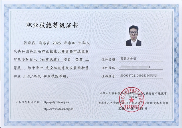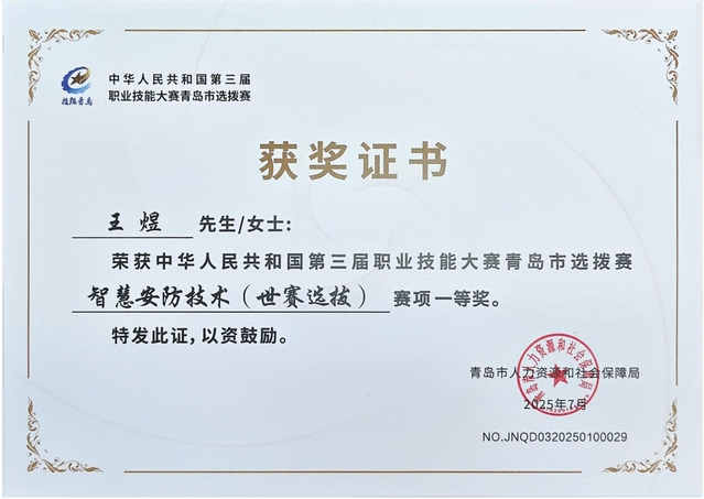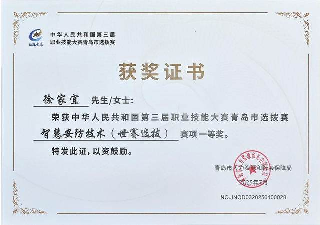 本网讯(酒店工程学院 张洪东)在第三届职业技能大赛青岛市选拔赛“智慧安防技术(世赛选拔)”中,我院2023级建筑设备工程技术专业学生徐家宜、王煜、张岩磊3名同学,在比赛中沉着应赛,熟练接线,精准调试,最终荣获一等奖2项、二等奖1项,张洪东、娄帅获评“优秀指导教师”。